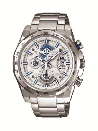 This Edifice model features a layered dial and 1/20th second chronograph that utilizes a mix of rotating disks and traditional sub-dials. A solid stainless steel band and case along with a multifaceted bezel add strength while a white face highlighted in blue accents add visual pop and clarity.